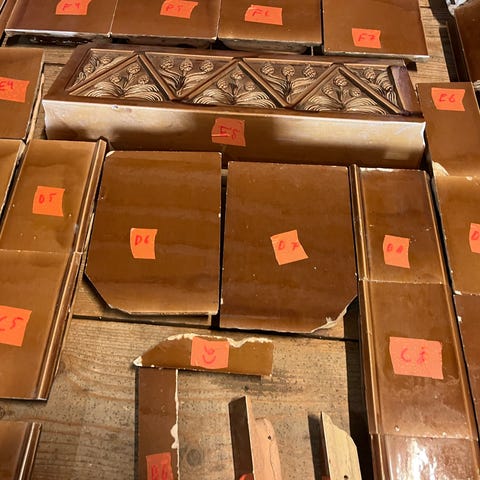 VARATTU. Turun kaakelitehtaan komea valkoinen kaakeliuuni. 1900 luvun alusta. Kruunun yläosat on saanut jokunen kolhu mutta muuten ehjät ja siistit kaakelit. Vaatii uudet osat sisältäpäin. Numeroituja, pakattu laatikoihin. Mitat ovat suunta antavia, saattaa poiketa hieman näistä.