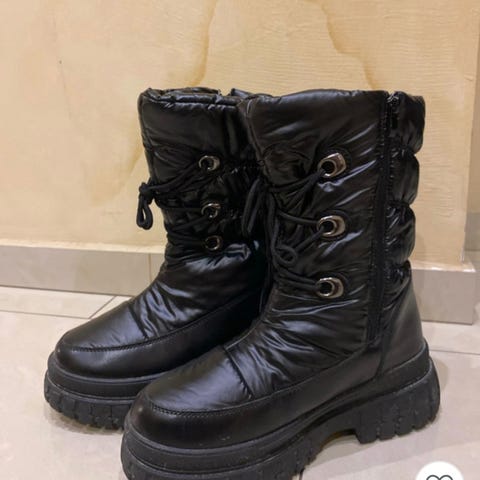 Uudet, käyttämättömät toppasaappaat karvavuorella ja vetoketjulla. Lisäksi sivulla heijastinnauha. Mielestäni kengänvarsi on leveähkö joten helppo pukea. Kengät ostettu sovittamatta ja olivatkin liian pienet joten nyt ylimääräiset. Kokomerkintä 41 mutta vastaa kokoa 39-40. Väriltään mustat joten ovat unisex.