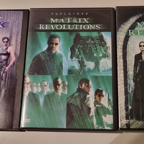 3 Matrix dvd:tä. Yhdessä levyssä oli "piskoja" ja yhdessä naarmu. Mutta pääosin siistejä,ei katsottu hetkeen.