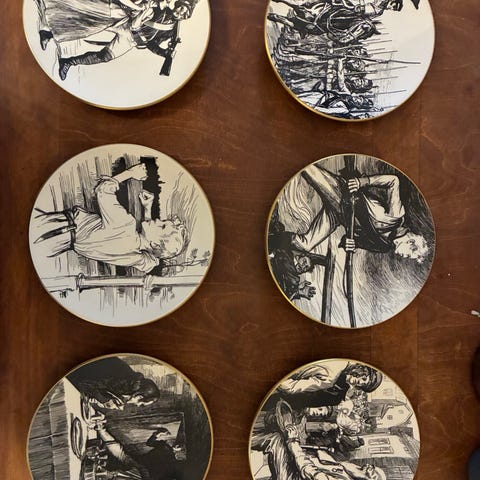 Erinomaisessa kunnossa oleva kokoelma Arabian Albert Edelfeltin kuvittamia Vänrikki Stoolin tarinat -seinälautasia. Kaikissa takana ripustushakanen. Myydään vain 6 kpl kokoelmana. Halkaisija 22.5 cm. Kaikkiin ehjät säilytyslaatikot mukaan.