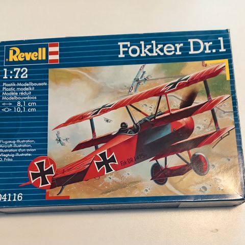 Revell Fokker Dr.1 Triplane pienoismallisarja mittakaavassa 1:72. Pakkaus sisältää muoviosista koottavan lentokonemallin sekä mallin kokoamiseen ja maalaamiseen tarvittavia tarvikkeita, kuten liimaa, pensselin ja pieniä maaleja.