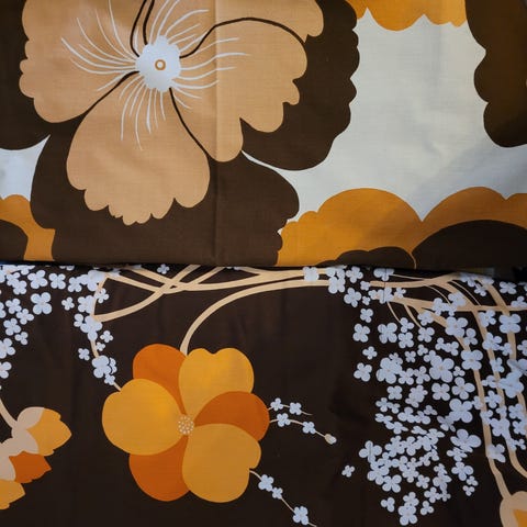 Retrohenkisiä kangaspaloja, jotka sopivat suoraan pöytäliinoiksi: Reunoissa ommellut taitteet. Tai sitten loihdit ompelukoneella omia luomuksia!