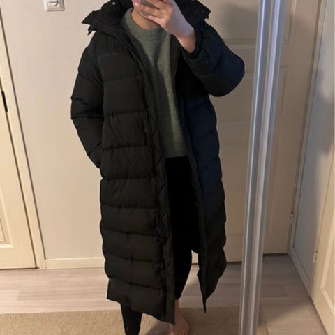 Nilkkapituinen lämmin untuvatoppatakki. Koko S. Pidetty vain muutaman kerran. Edessä musta "Marimekko"-teksti.