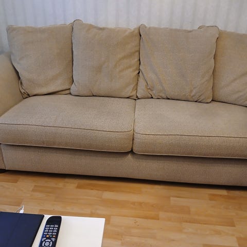 Myydään hyväkuntoinen 2 vuotta vanha Askosta ostettu sohva. Väri vaalea beige. Kankaassa joitain pieniä tahroja, mutta yleisilmeltään siisti. Kankaat saa irroitettua tyynyistä.