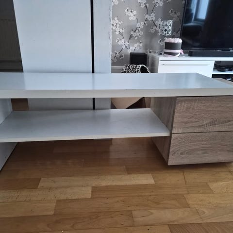 Tv taso hyvässä kunnossa, muutamia käytön jälkiä/naarmuja (niistä kuvat). Vasemmasta hyllystä puuttuu yksi ruuvi muttei vaikuta käyttöön ollenkaan.
