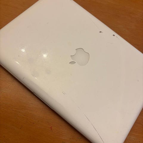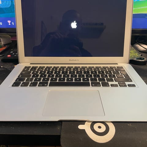 Apple MacBook kannettava tietokone. Hopeanvärinen, mustat näppäimet ja suuri kosketuslevy. Näytön koko on arviolta noin 13 tuumaa. Mukana virtalähde ja virtajohto, jotka näkyvät kuvissa. Vanhaa malli tarvii toimiakseen uutta Applen järjestelmää. Parhaiten onnistus uudemman Macin kanssa, mut mulla ei sellasta oo ni myyn.