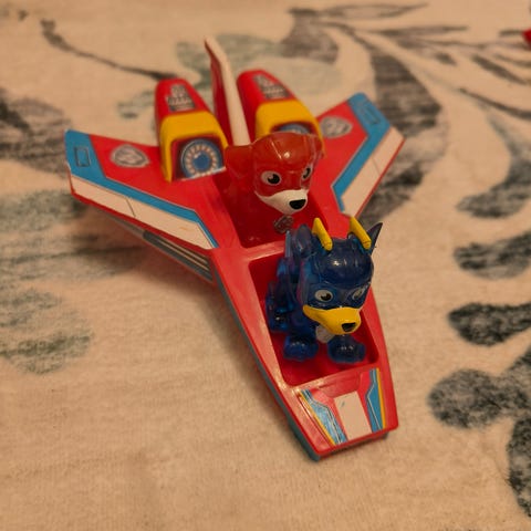 Ryhmä Hau leluhelikopteri Skye-hahmolla. Harmaa ja vaaleanpunainen muovinen helikopteri, jossa kiinteä Skye-koirahahmo ohjaamossa. Lelussa on pyörät pohjassa ja pyörivä roottori. Sopii lasten leikkeihin Ryhmä Hau -teeman kanssa ja muiden saman sarjan hahmojen ja ajoneuvojen rinnalle. Ei käytönjälkiä.