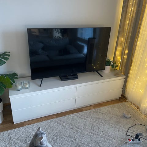 Ikean Fjällbo merkkinen taso. Mitat 150x36x54 cm. Metallista ja massiivipuusta valmistetussa tukevassa tv-tasossa on avoin takaosa, joten johtojen ja kaapeleiden järjestäminen on helppoa. Pieni jälki kannessa.