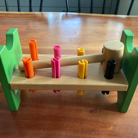 Siisti käytetty kunto. Pientä käytönjälkeä. Puinen vasara ja pöytä, hakattavat osat muovia. Hinta 8€+postit. Mmm