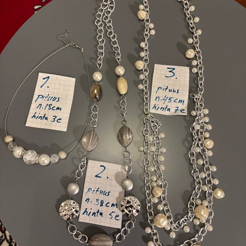 Kuvissa useampi koru, joissa muovisia helmiä ja osia eri väreissä. Sopii naisten käyttöön arkeen tai juhlaan asusteeksi. Kaulakorut 48 ja harmaa 50cm pitkä.