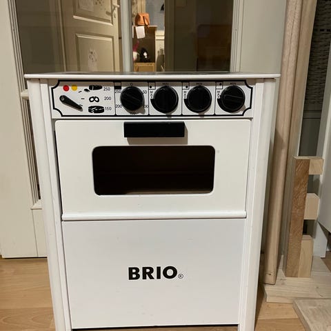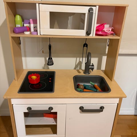 Valkoinen leikkikeittiö, jossa mukana lautasellinen leikattavia vihanneksia, kattila ja paistinpannu, kokin hattu ja patakinnas sekä muita ruokia. Uuniin ja levyihin säätönappulat. Allas lähtee irti ja on meillä toiminut mm uunivuokana.