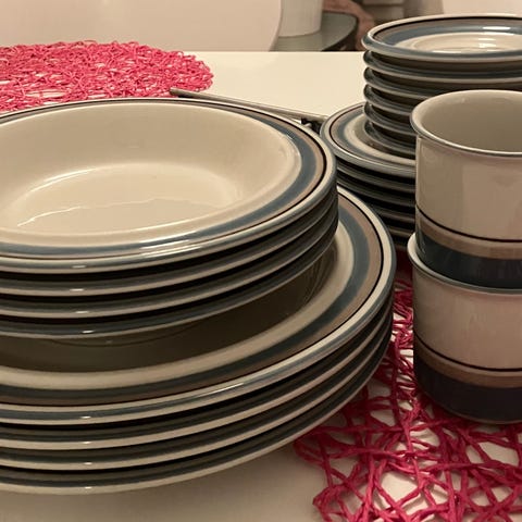 Arabia Uhtua ruokalautaset siniharmaalla reunuskoristeella. Lautaset ovat vaaleat, ja niissä on kaksivärinen reunaraita. Sopivat esimerkiksi ruoka- tai aamiaistarjoiluun. Pohjassa Arabia Finland Uhtua -leima. Halkaisija 24 cm. Kunto kuin uusi.