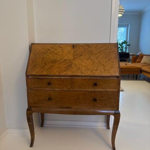 Vintage kirjoituslipasto, jossa on alaosassa kolme vetolaatikkoa ja avohyllyt yläosassa. Ulosvedettävä kirjoitustaso keskellä sekä kaksi lokerikkoa. Mukana avain.