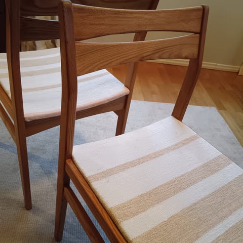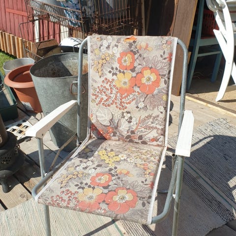 Kätevät tuolit, taitettuina eivät vie paljon tilaa, selkänojallinenkin taittuu alas. Puunväriset ovat isäni 1960 luvulla tekemät ja usein käytössä olleet. Toisen tuolin markiisi repeytynyt. Sinisävyiset ovat enempi tehdastuotannon tyyliset, eikä alkuperästä tietoa. Myydään mielellään kaikki kerralla 50 euron yhteishintaan. Muutoin puunväriset 2 kpl 25€ yhteensä ja siniset 2 kpl 35€ yhteensä. Mielellään nouto.