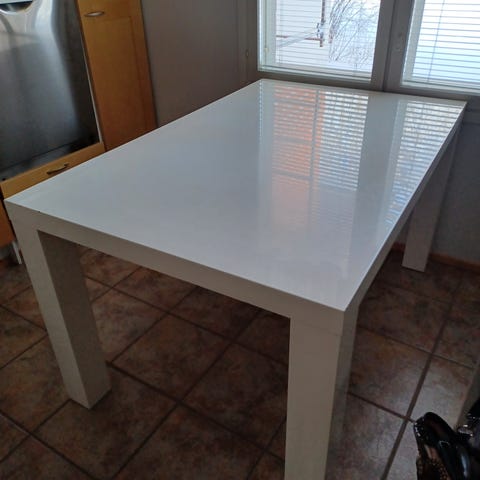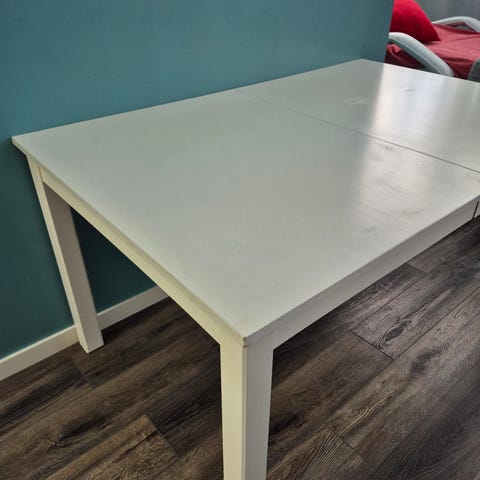 Jatkettava valkoinen pöytä ja kuusi tuolia. Tuolit pientä kolhua ottanut, pöytä suht siisti. Vain nouto Kuopion Neulamäestä. Tarvitset lenkkiavaimen pöydän jalkojen irrotukseen. Huom! Tuolit varattu, pöytä vapaana!