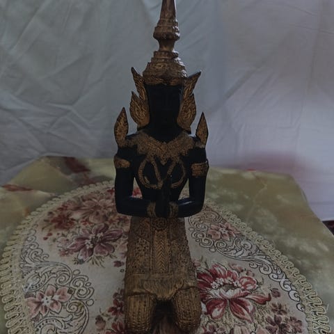 Korkeus 29cm ja leveys 25cm ja Ostettu balilta. Painava metallinen esine. Rakkauden ilon ja myötätunnon symboli