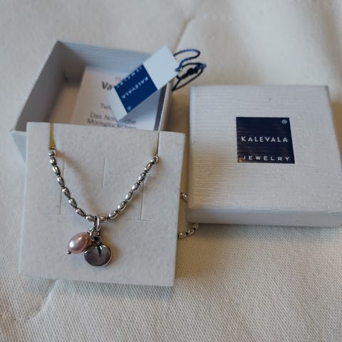 Kalevala Vanamo-sarjaan ranne-/nilkkakoru. Materiaalina hopea, jossa vaaleanpunainen helmiriipus. Ketjun pituus 24cm.