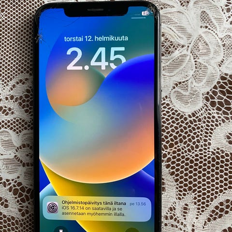 Apple iPhone X älypuhelin, tallennustila 64 GB. Laitteessa on täysikokoinen kosketusnäyttö, jossa etukameran ja anturien yläosa lovessa. Väri on hopea, kiiltävä lasinen takakuori ja alumiinikehys. Takana on kaksoiskamera pystysuunnassa sekä salama. Näytön yläkulmassa on näkyvissä halkeamia, jotka voivat vaikuttaa näytön ulkonäköön. Puhelin soveltuu puheluihin, viestintään, internetin selaamiseen, sovellusten käyttöön ja valokuvaukseen. Akkuasetuksista näkyy akun kunnon prosenttiosuus, joka antaa viitteitä akun kapasiteetista ja käyttöiästä.