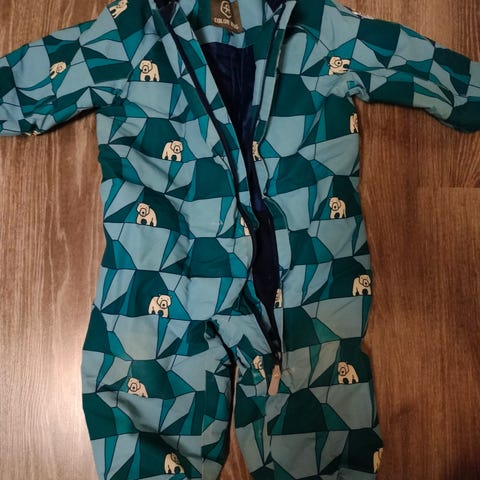 Käytetty lasten toppapuku, takki ja henkselihaalarit. Takissa huppu, jossa karvareunus. Koko 86. Ehjä, siisti puku.