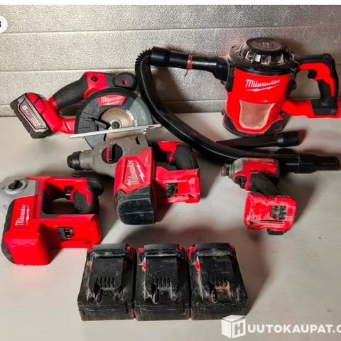 Milwaukee akkutyökalukokonaisuus, joka sisältää useita eri käsityökoneita, akkuja sekä laturin. Kaikki akut ja koneet ovat toimivia.