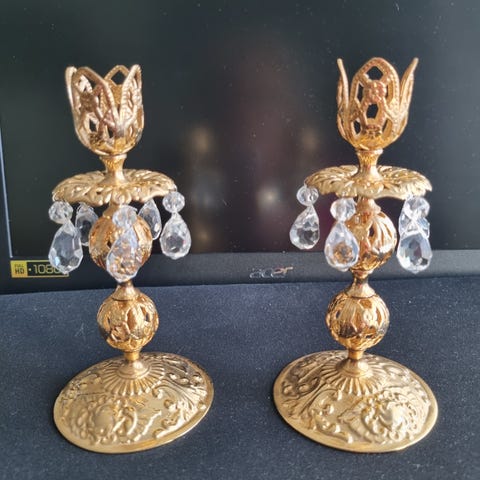 Turun kristalli k. 26cm ja leveys 24cm,kynttilänjalka kristalliriipuksilla. Kynttilänjalassa on kullanvärinen metallirunko ja useita läpinäkyviä kristalliriipuksia koristeena. Jalusta on muotoiltu koristeelliseksi ja kynttilänjalkaan mahtuu kolme kynttilää. Sopii pöytäkynttilöille sisustuselementiksi esimerkiksi olohuoneeseen tai ruokapöydälle.