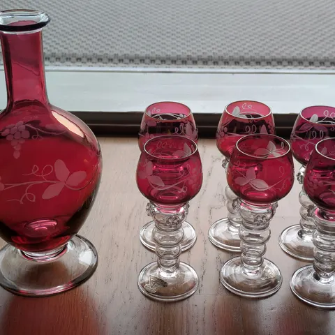 Setissä 4 lasia, joissa kaiverrettu kukka- ja rypälekuviointi. Kauniit ja hyväkuntoiset, ikää näillä jo useampi kymmenen vuotta (40-50 vuotta). Toridiili. Normipostitus tai noutokin onnistuu, samaan pakettiin mahtuu muutakin.
