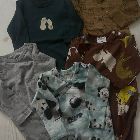 Myydään vaatepaketti, jossa on koon 62 vaatteita.