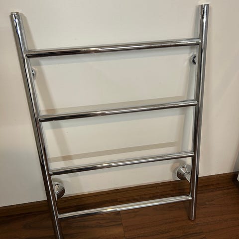 Kromattu, sähkökäyttöinen pyyhekuivain, muistin mukaan Rejdesignin mallistoa. Leveys 64 cm, korkeus 34 cm.