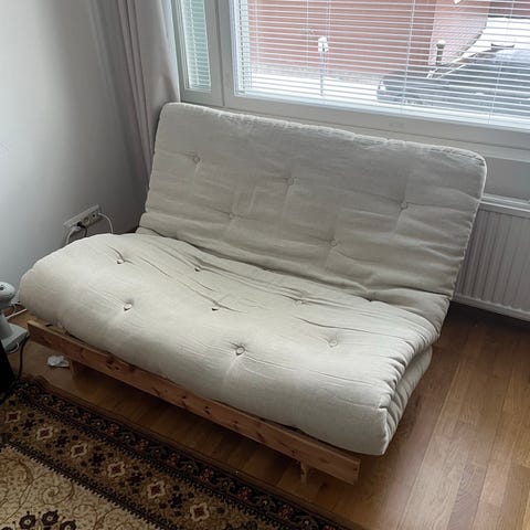 Futon-sohva, joka voidaan avata patjaksi.