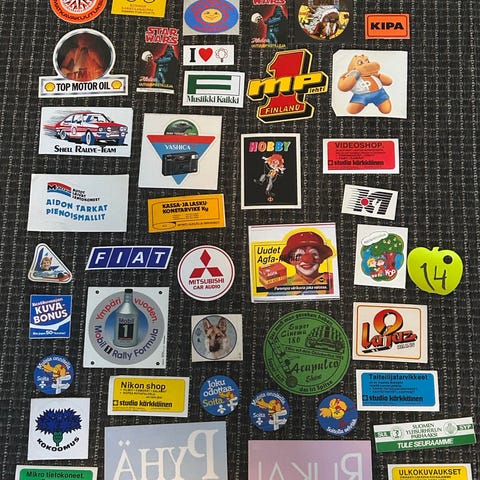 Huomaa että tarrat ovat 40-50 vuotta vanhoja joten liimapinnan pitävyydestä ei ole varmuutta. Isot tarrat saattaa olla taiteltu. Tämä näkyy kyllä kuvissa.