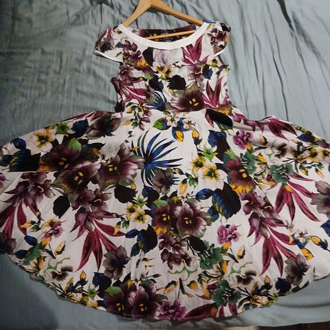 50-luku mekko, tummansinisellä pohjalla vaalean sinisiä palloja. Kaksi nappia edessä, Vetoketju takana.