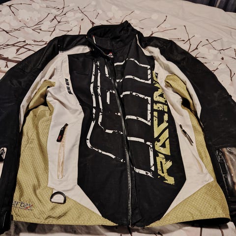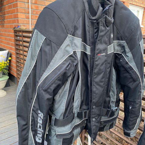 MP ajopuku, johon kuuluu ajotakki ja henkselilliset ajohousut. Väri on musta. Takissa useita taskuja ja säätöremmejä. Housuissa säädettävät henkselit ja lahkeissa vetoketjut. Sopii moottorikelkkailuun ja muuhun talviajoon.Koko L