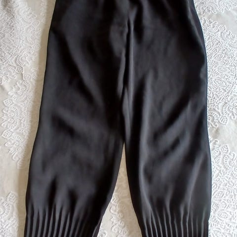 Cosin mustat suorat housut pehmeää silkkisekoitetta, koko 36. Kuminauhavyötärö ja sivutaskut, etupuolella valesepalus. Hyväkuntoiset.