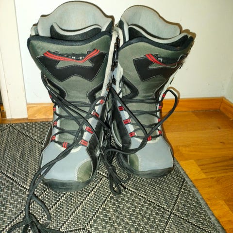 Lumilautakengät, koko 46 (merkitty myös 300). Väritys harmaa ja musta, nauhakiinnitys ja korkea varsi. Kengissä on irrotettavat mustat sisäkengät, joissa oma nauhakiinnitys ja pehmustettu varren yläosa. Pohjassa karkea kuviointi, joka antaa pitoa lumella ja jäällä. Soveltuvat lumilautailuun