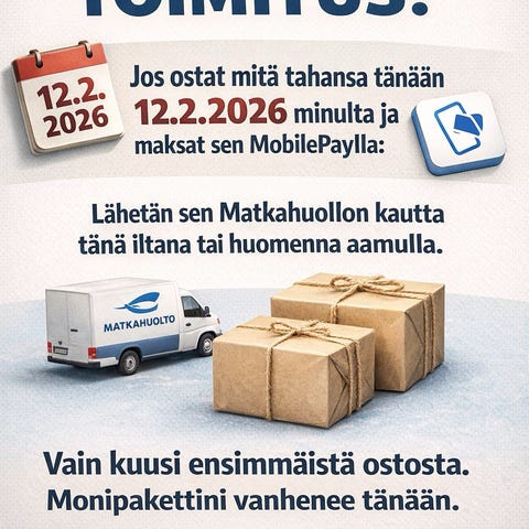 Ilmainen toimitus, jos ostat mitä tahansa tänään 12.2.2026 minulta ja maksat sen MobilePaylla. Lähetän sen Matkahuollon kautta tänä iltana tai huomenna aamulla. Vain kuusi ensimmäistä ostosta. Monipakettini vanhenee tänään.