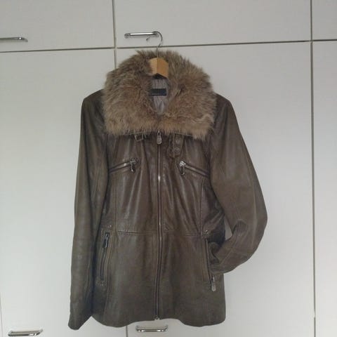 Ruskea, taskullinen vyötärömallinen nahkatakki. Vetoketju.