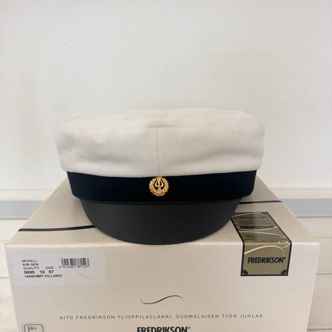 Perinteinen Fredrikson-ylioppilaslakki sinivalkoisella vuorella. Lakin päälliseen on käytetty perinteistä valkeaa samettia. Nahkamassasta valmistetut lippa ja hikinauha tuntuvat yhtä hyviltä kuin näyttävätkin. Arvokkaan kokonaisuuden kruunaa kullattu lyyra.