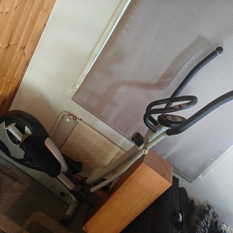 Kokoontaitettava kuntopyörä. Toimii, mutta mittaristo ei peritä. Polkeminen onnistuu, vastussäätö 1-8