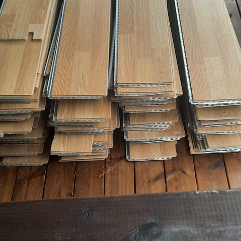 35 pakettia 102,2 m2 vaalean harmaata tammi laminaattia. Uusia