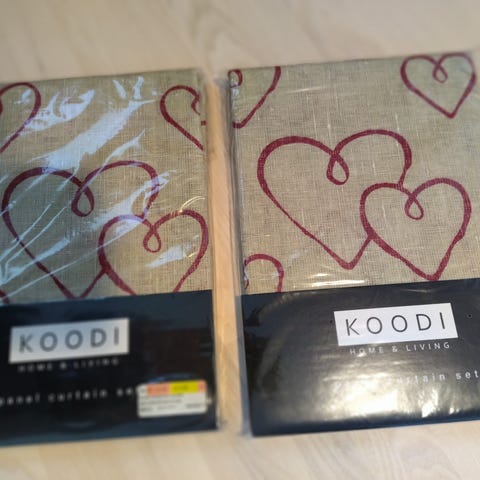Pellavan tyyppistä kangasta olevat verhot sekä 2 kpl samaa sävyä olevat tabletit.