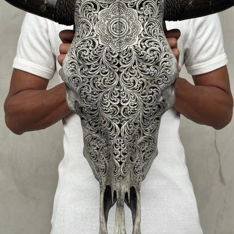 Suuri käsin kaiverrettu härän kallo, jonka ovat kaivertaneet taiteilijat, jotka ovat siirtäneet muinaisen kaiverrustaidon isältä pojalle. Kallo on täysin käsin veistetty suurella huolella. Se on epätavallinen, koristeellinen kappale.Kaiverrus kalloon on kaunis Badong-motiivi.Arvioidut mitatKorkeus: 51 cmLeveys: 47 cmVastuuvapauslausekePäähän on kiinnitetty kiristysnarusta, jotta se voidaan kiinnittää seinälle.Sarvet irrotetaan kuljetustarkoituksiin ja ne on helppo kiinnittää uudelleen. Sarvet on aina pakattu laatikon pohjalle, kallon alle. Varmistathan, että poistat sarvet ennen pakkauksen hävittämistä.- Koska kyseessä on luonnollinen kallo, siinä saattaa olla joitakin luonnollisia pieniä halkeamia, uurteita tai puuttuvia hampaita. Tämä on normaalia. Katso kuvat viitteeksi.- Kallomme puhdistetaan ammattilaisvoimin, mutta joskus hampaissa voi esiintyä pieniä värjäytymiä. Tämä on luonnollista ja normaalia, eikä siihen voida paljoa vaikuttaa. Katso kuvat.Olemme lisänneet kuvia käsityöläisistämme työssään antaaksemme kuvan siitä, millainen prosessi on kaiverratetun pään luominen.Paino, joka mainitaan, sisältää pakkausmateriaalin.LähetysKohde lähetetään seurantanumerolla DHL Parcelin, DPD:n tai postNlin kautta. Seuranta päivittyy Catawiki-luettelossasi, kun pakettisi on jätetty postiin.Ole hyvä ja tarkista säännöllisesti välttääksesi pakettisi palautumisen meille, jolloin ostaja vastaa toisen lähetyksen toimituskuluista.Seurantaan Espanjaan ja Portugaliin käytä tätä linkkiä ja lisää Catawiki-erästäsi saatu seurantanumero.https://clientesparcel.dhl.es/LiveTracking/HomeME EMME YHDISTÄ TOIMITUKSIA!!!Jos sinulla on kysyttävää paketistasi, ota meihin yhteyttä Catawiki-viestipalvelun kautta. Pyrimme vastaamaan kolmessa työpäivässä.