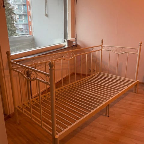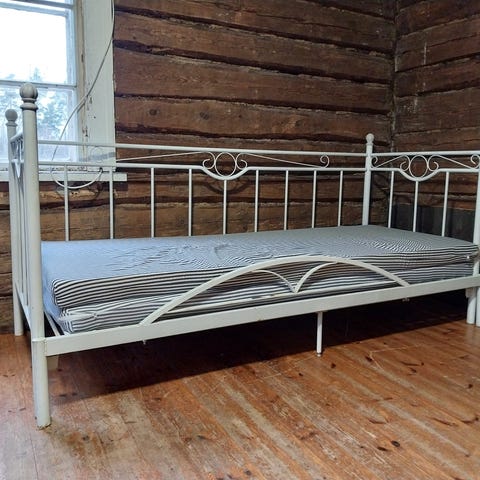 Metallinen musta sohvasänky, jossa koristeelliset päädyt ja selkänoja. Sopii yhden hengen sängyksi tai sohvatyyppiseksi lepopaikaksi esimerkiksi makuuhuoneeseen tai olohuoneeseen. Vuodekehikko on suunniteltu käytettäväksi patjan kanssa, ja sen alle jää tilaa säilytykselle riippuen patjan korkeudesta ja vuoteen mitoista. Patjan saa mukaan ilmaiseksi. Sohvasänky on jatkettava, eli siitä saa parivuoteen tarvittaessa (tätä toimintoa emme ole koskaan käyttäneet). Vain nouto. Tuote pitää purkaa paikan päällä osiin, meillä on ohjeet kokoamiseen. Tämä on arvokas, kestävä tuote, jonka saat nyt todella huokeaan hintaan siirtovaivan vuoksi!