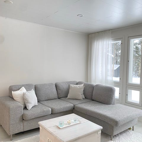Upea, eläväpintaisella tummanharmaalla kankaalla verhoiltu HT Collectionin sohva. Pituus 310, divaanin kohdalta 150. Untuvatäytteiset istuin- ja selkätyynyt. Päälliset saa irti ja ovat vesipestävät. Yhden istuintyynyn sauma muutaman sentin auennut, jää väliin piiloon ja on helposti korjattavissa. Hopeanväriset metallijalat. Erittäin mukava istua ja pötkötellä, pysyy hyvin ryhdissään.