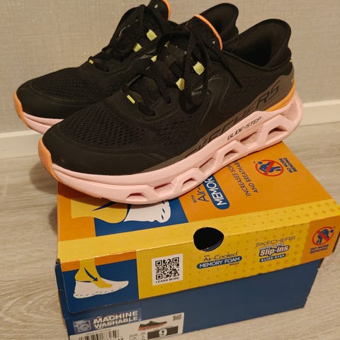 Skechers Slip-ins juoksukengät, koko 42. Väri musta valkoisella pohjalla. Päällinen verkkokangasta ja synteettistä materiaalia, nauhakiinnitys ja Slip-ins-rakenne helpottamaan jalkaan laittoa. Sopivat juoksuun ja muuhun liikuntaan.