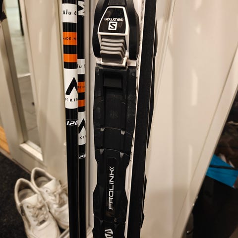 Suksien mukana tulee 145cm pitkät sauvat ja Salomonin 38 2/3 kokoiset monot.