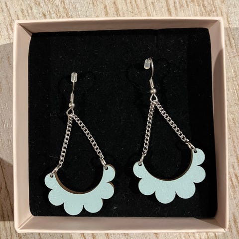 Yksittäisiä kertoja käytetyt Kaarella-korvakorut. Korkeus ~6cm ja leveys ~3cm.