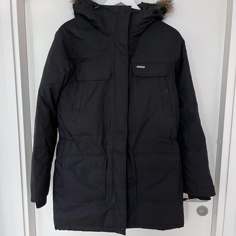 Tosi lämmin talvitakki. Huppu, tilavat napilliset taskut, edessä myös rintataskut, toisessa hihassa pieni vetoketjullinen tasku ja sisäpuolella verkkokankaasta povitasku.