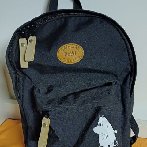 Muumikuvioinen pikkureppu. Pehmustetut ja säädettävät olkahihnat, etutasku ja kaksi sivutaskua, joista toiseen mahtuu esim. juomapullo. Kantokahvat saa kiinnitettyä toisiinsa nepparikiinnityksellä.