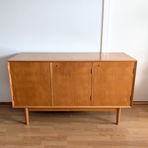 Todella hieno tiikkinen senkki 1960-70-luvulta, vaikka TV-tasoksi tai vinyylisoittimelle, sivupöydäksi kukille. Neljä siistiä vetolaatikkoa kullatuilla-/mustilla vetimillä ja liukuvat hyvin, ylimmässä toimiva lukko ja avain. Molemmissa kaapeissa toimivat lukot ja avain sekä irtonaiset hyllylevyt vaikka vinyylejä varten. Vähäistä ja kaunista patinaa, henkii aikaansa. Kauttaaltaan kauniisti käsitelty ja kunnostettu vanhaa kunnioittaen, joten suoraan käyttöön.