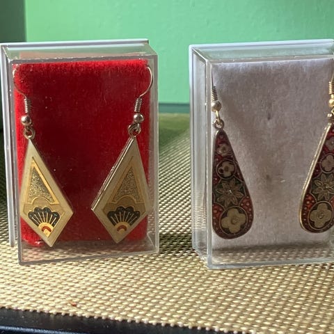 Yksittäisiä kertoja käytetyt Aamuyön Design -korvakorut. Korkeus ~4cm. Säilytetty umpinaisessa laatikossa suojassa, ei alkuperäispakkausta tallessa.